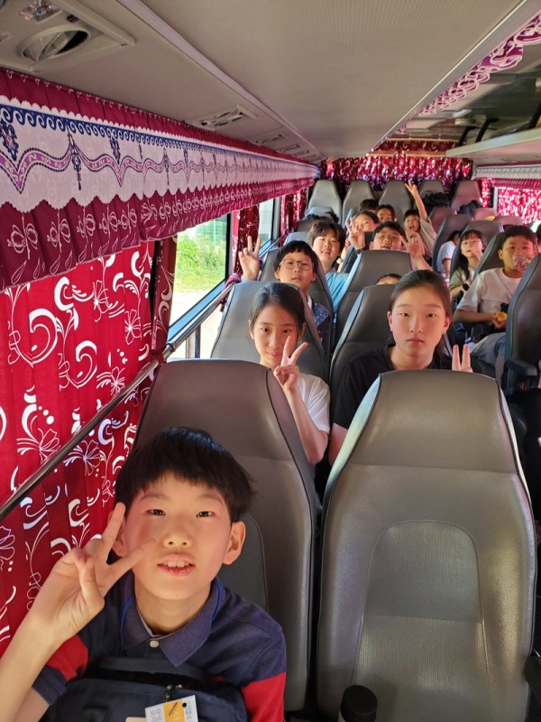 선사 1,2모둠 26명의 아이들은 안범준 기사 선생님과 함께 학교 스쿨버스를 타고 공주 석장리 박물관을 향해 가고 있습니다.