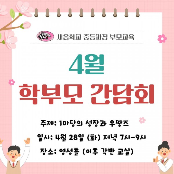 [새음학교 중등과정 4월 학부모 간담회 안내]