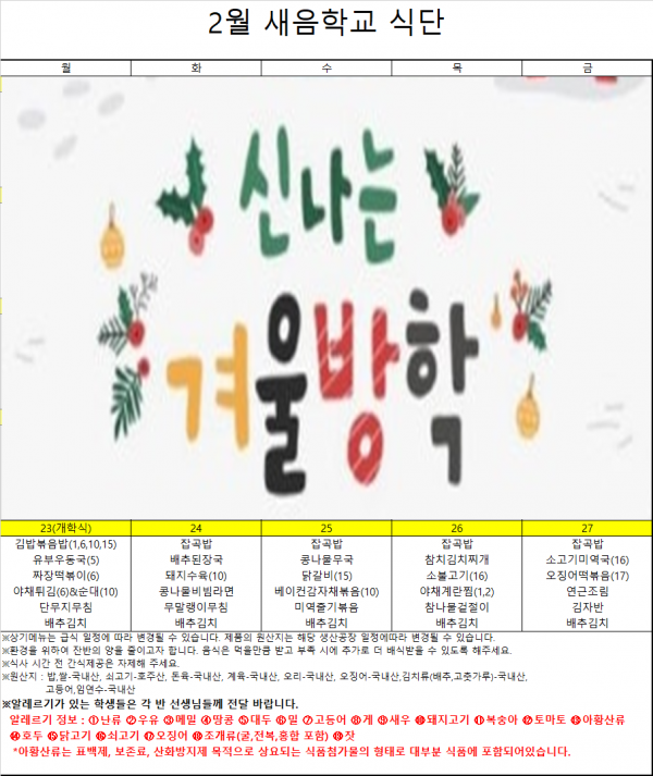 2026년 2월 식단표 조회수 15 작성일 2026-02-23 본문 맛있게 드세요! 목록으로 이전글2026년 2월 23일 급식 2026-02-23 다음글2025년 12월 9일 급식 2025-12-11 댓글(0) 댓글목록 등록된 댓글이 없습니다.
